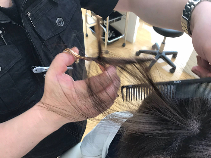 毛髪交差の原因となっている毛流に癖がある髪を根元からカットする技法