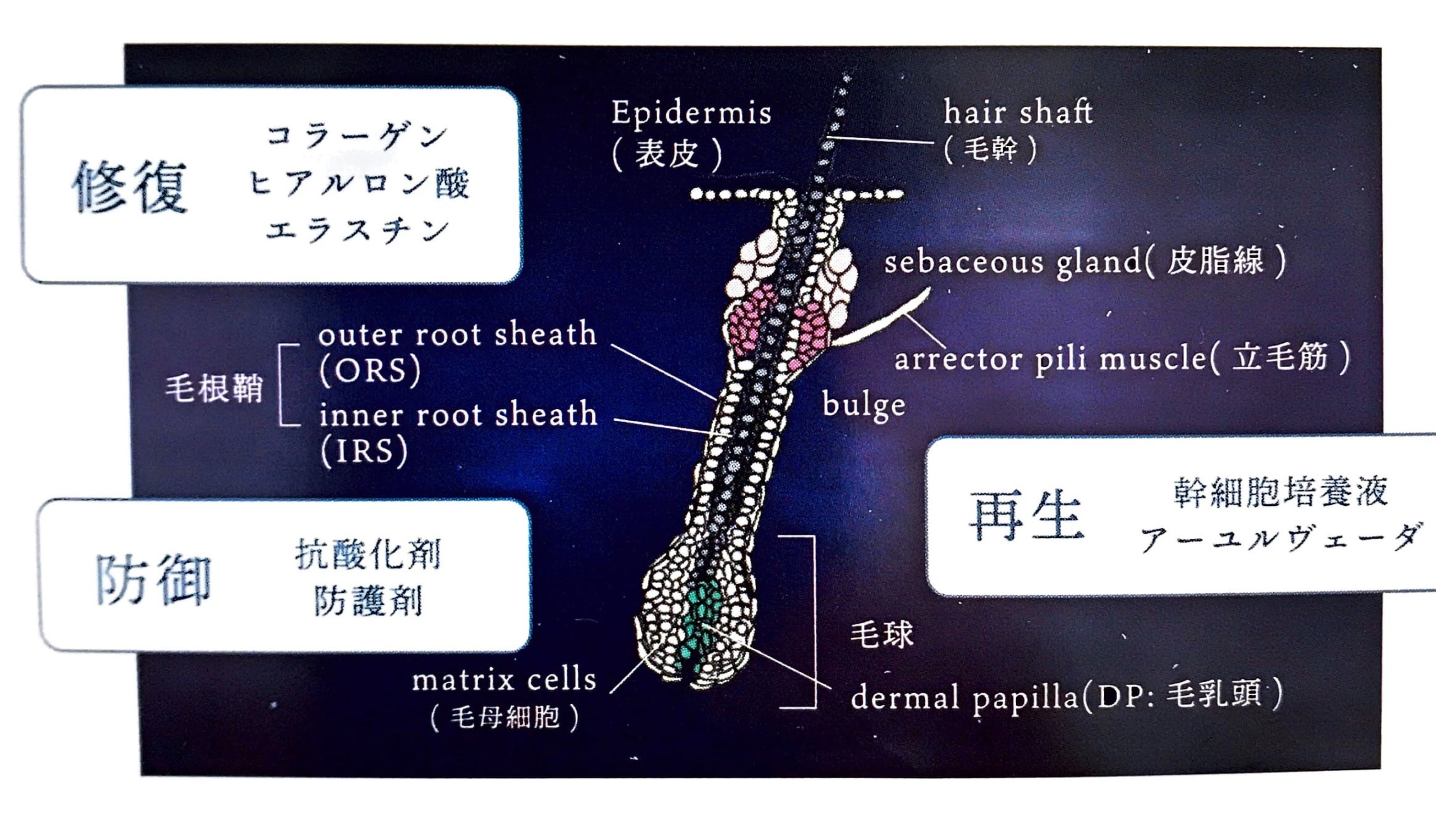 頭皮環境のバックボーンでもある幹細胞に栄養を直接与えることで、頭皮環境の若返りを図ります。これまでの髪質改善を超え、髪質改革へ